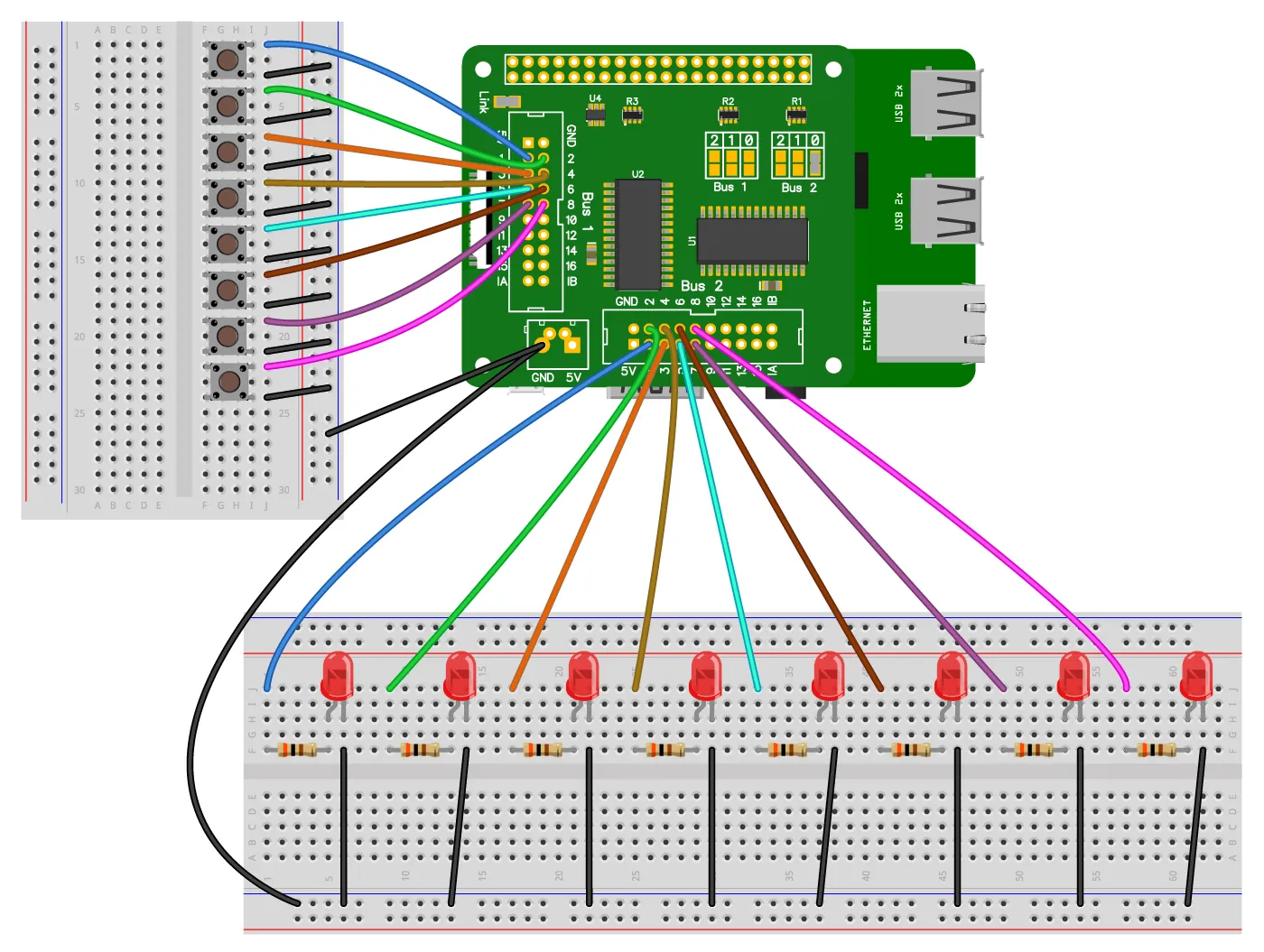 This tutorial will monitor 8 buttons and show their status with 8 LEDs. When a button is pressed, the corresponding LED will be turned on for 1 second. You will need your Raspberry Pi, an IO Pi Plus, 8 buttons, 8 LEDs and 8 300R resistors. The diagram to the right shows how the components will be connected, with the buttons on Bus 1 and the LEDs on Bus 2.